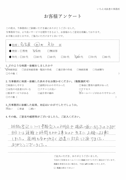 手続きに供い、何もかも解らない中、インターネットで検索したところ、評価が高く、女性ということもあり勇気を出して依頼しました。説明も分かりやすく、手続きも迅速に対応して頂き、おまかせして良かったと思いました。また何か相談がある際はこちらにお願いしたいと思います。
