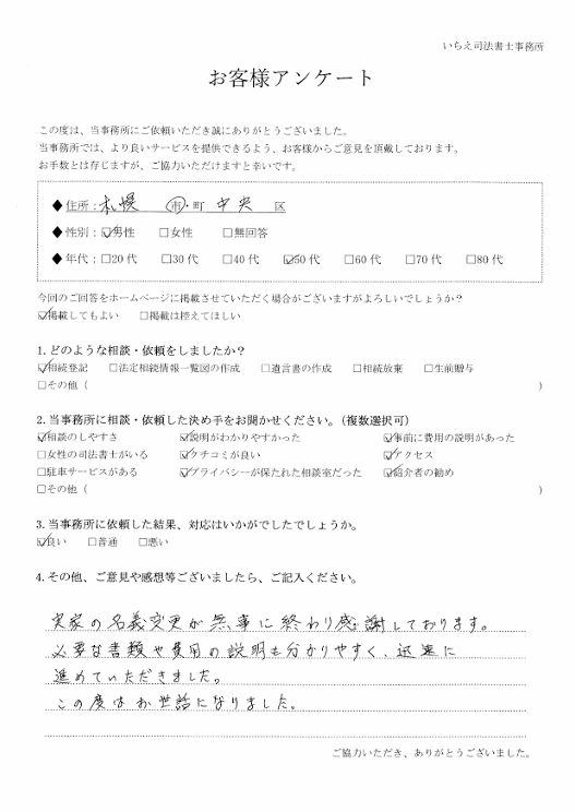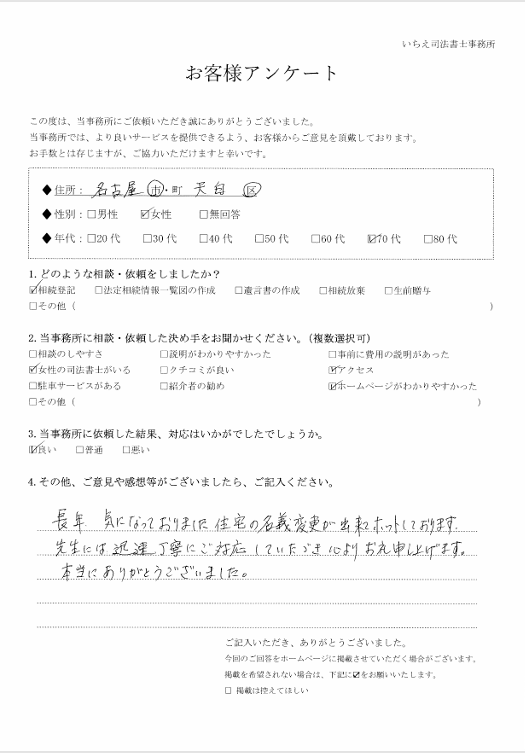 長年、気になっておりました住宅の名義変更が出来てホットしております。